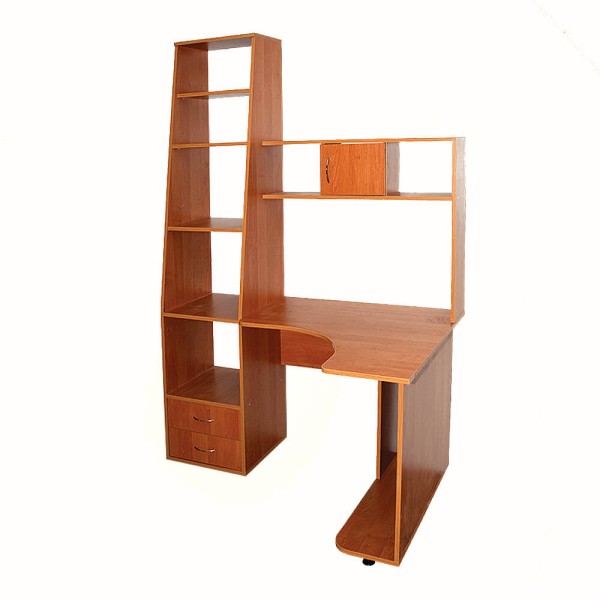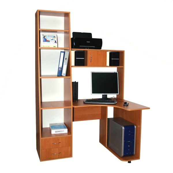 Комп'ютерний стіл «Ніка 13» - стіл і стелаж. Перевага цього столу додає стелаж, в якому глибокі і широкі полиці. На них легко побачити і знайти всі розкладені речі. Для особистих речей передбачені висувні шухляди. Комп'ютер і оргтехніка легко встановлюються на спеціально розроблені полички. Наявність стелажа може допоможе не купувати поличку на стінку.