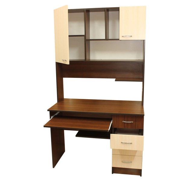 Прямий комп'ютерний стіл з надбудовою. Під стільницею стіл має полицю під клавіатуру, блок з чотирьох шухляд та невелику полицю на рівні колін. У надбудові дві шафки та декілька полиць з задньою стінкою.