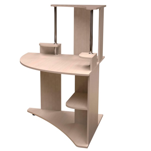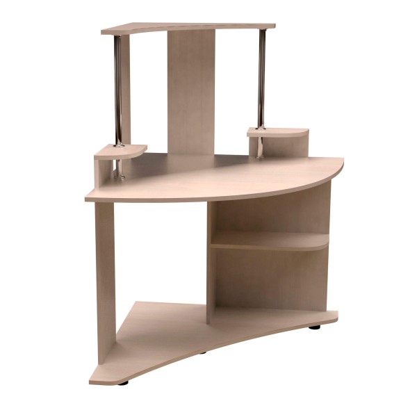 Вузький кутовий комп'ютерний стіл з надбудовою. Стіл розміщений на основі, розмір якої відповідає ширині та глибині столу - 900 мм. Трикутна полиця на металевих хромованих стійках знаходиться на висоті 1280 мм. Симетрично з обох боків стола - полиці для колонок. Під стільницею - кутова полиця. Стіл розміщений на 4-х ніжках.