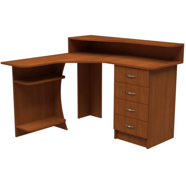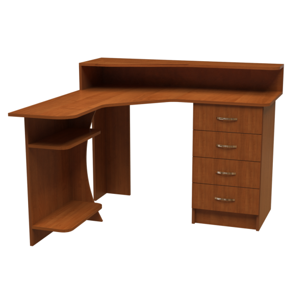 Кутовий комп'ютерний стіл, ширина та глибина - 1200 мм. Полиця для монітора та колонок знаходиться над стільницею на висоті 150 мм. Тумба з чотирьох шухляд та відсік для системного блоку розташовані по краях столу під стільницею.