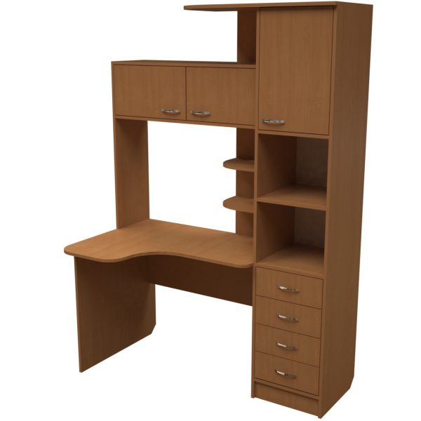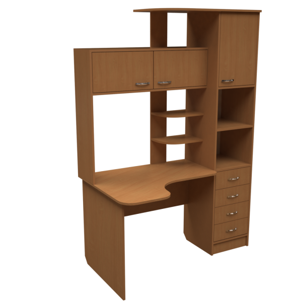 Високий кутовий комп'ютерний стіл. Висота з надбудовою - 2000 мм. Розмір кутової стільниці - 1000x800 мм. Над стільницею - горизонтальна шафка з двома дверцятами та три кутові полиці. Особливістю конфігурації столу є наявність вбудованого пенала, який містить шафку, дві полиці та блок з чотирьох шухляд.