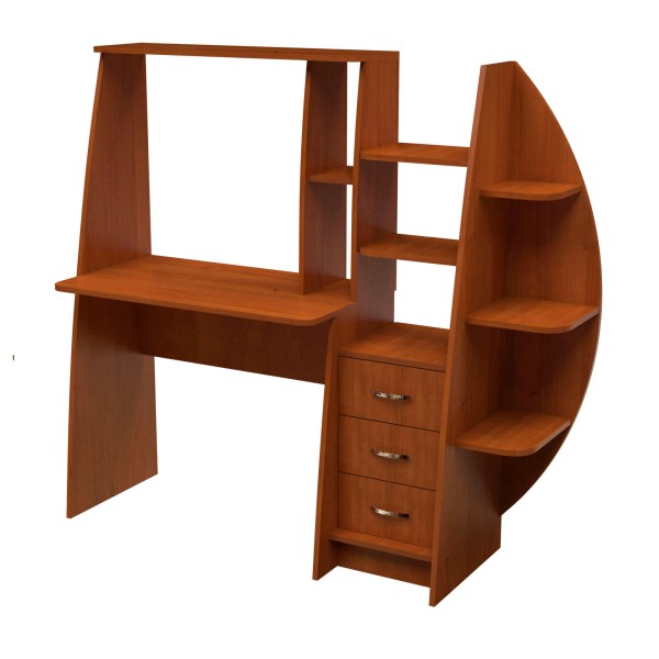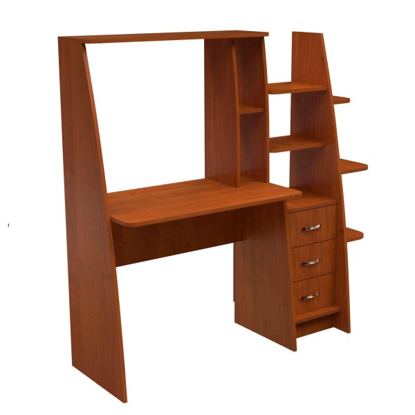 Прямий комп'ютерний стіл з надбудовою. Полиця у надбудові знаходиться на висоті столу - 1420 мм. Ширина стільниці - 880 мм. При стандартній орієнтації тумба з шухлядами знаходиться праворуч, над нею - дві відкриті полиці. Кутова конструкція з трьома полицями приєднана до столу за допомогою бокової стінки.
