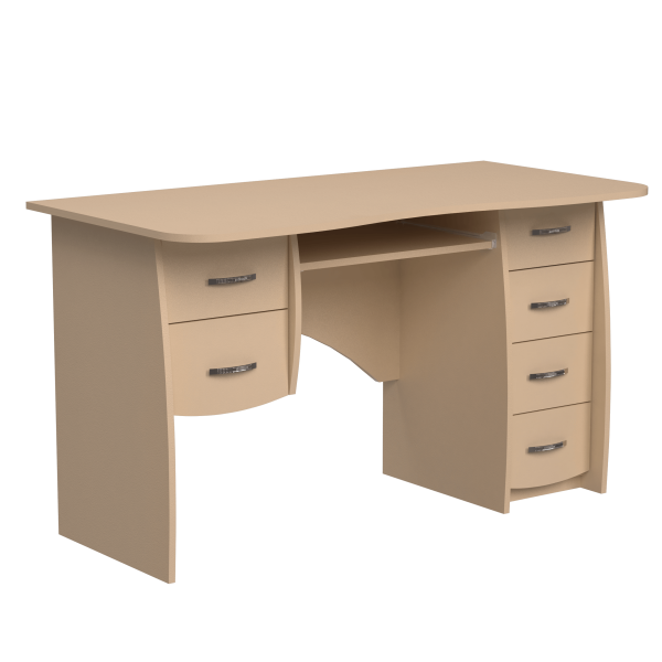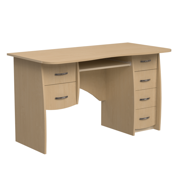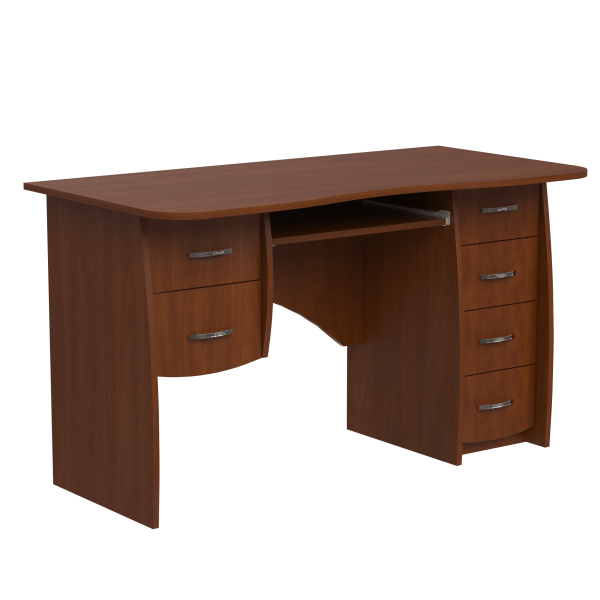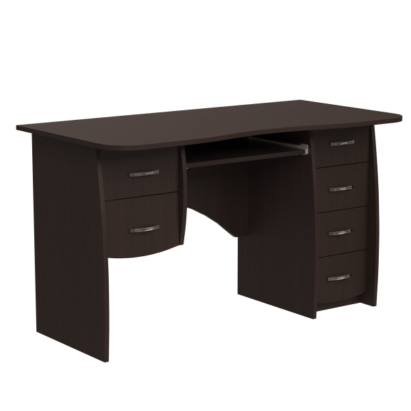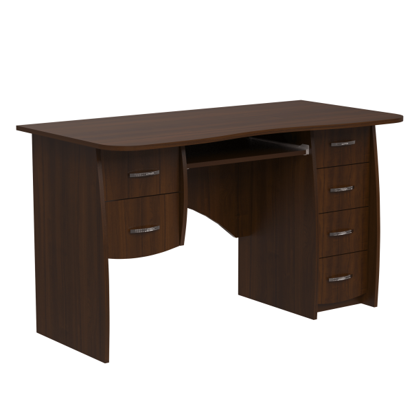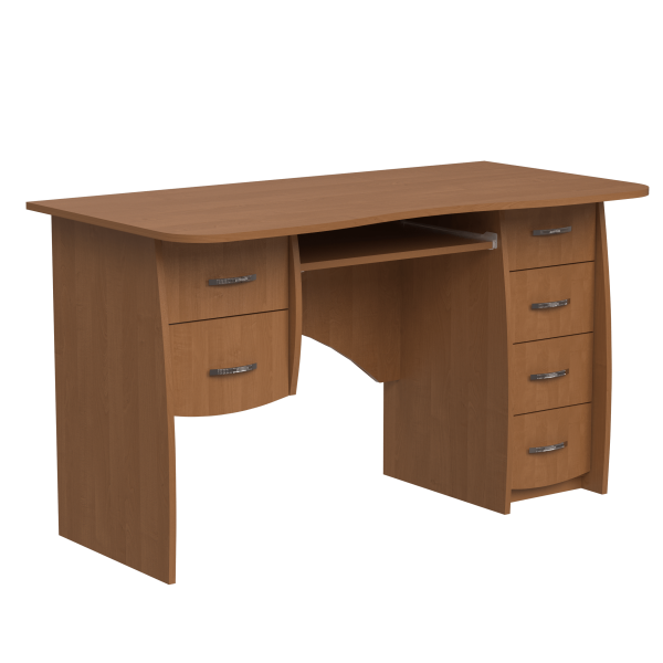 Класичний прямий комп'ютерний стіл, 1300 мм завширшки. При стандартній орієнтації блок з двох шухляд знаходиться ліворуч полиці під клавіатуру, а тумба з чотирьох шухляд - праворуч. Ніжки стола мають слегка закруглену форму. Задня стінка стола - фігурна.