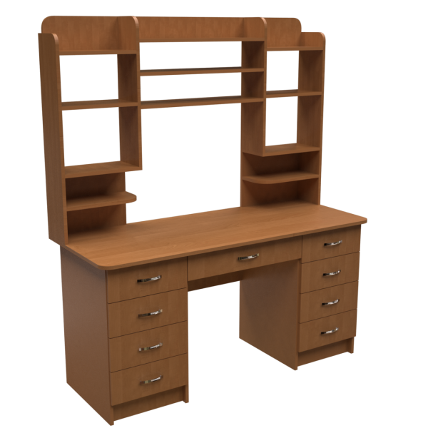 Симетричний прямий комп'ютерний стіл з надбудовою. Надбудова по всій ширині стола з різноманітними полицями: відкритими та з задньою стінкою. Під стільницею симетрично розташовані тумби з чотирьох шухляд та широка шухляда між ними.